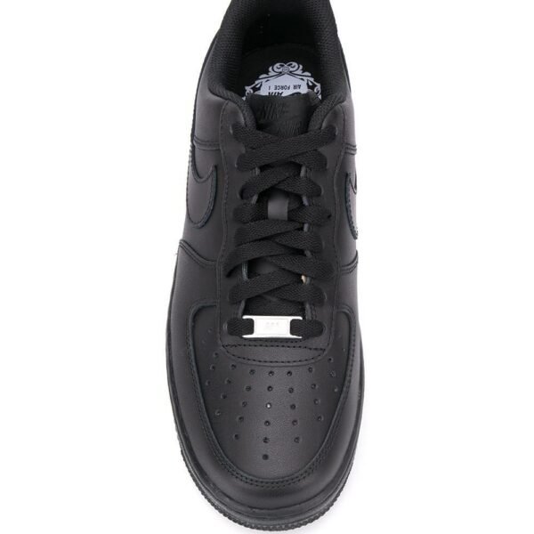 Black leather Air Force 1 ’07 low-top sneakers from Nike featuring a signature Nike swoosh, a perforated style, a round toe, a lace fastening and a flat rubber sole.